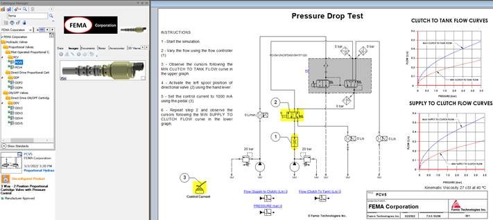 Figure 2. FEMA Corporation’s pilot operated proportional cartridge valve is shown in the Automation Studio™ Catalogue Manager on the left, and in a pressure drop test on the right.